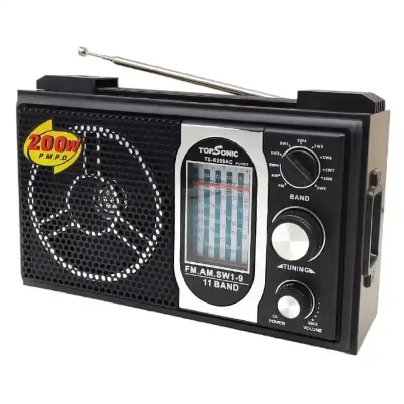 Radio Multibanda TopSonic TS-R208AC – 11 Bandas AM/FM/SW Radio portátil de estilo clásico con excelente recepción y sonido potente. Cuenta con 11 bandas (AM, FM y SW1-9), perilla de sintonía precisa y antena telescópica para mejor señal. Incluye altavoz frontal de alta calidad, entrada para audífonos 3.5 mm y puerto para micrófono. Funciona con corriente AC o pilas tipo D (no incluida) ideal para el hogar, viajes o emergencias. Diseño compacto, resistente y fácil de transportar. Medidas aproximadas: 21 cm x 12 cm. Producto nuevo, práctico y confiable para escuchar radio local e internacional.