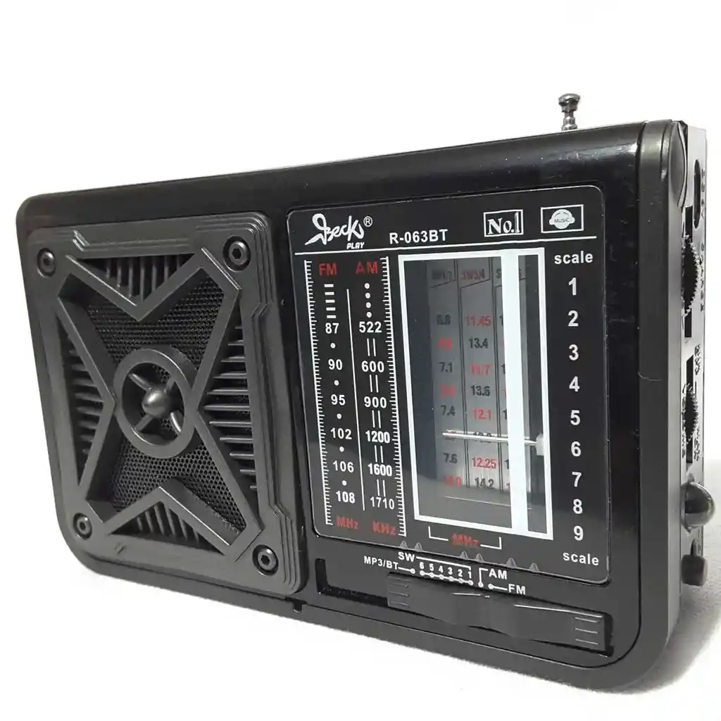 Hola! somos OKshop! /Estamos atentos para servirte//Con Conexion Bluetooth y Linterma///Radio Multibandas (8 Bandas) Am Fm con puerto Usb, MicroSD, conexion Bluetooth, totalmente Recargable para q disfrutes de tus emisoras o musica favorita por mas tiempo.Con una potente linterna led al igual q su fuerte volumen (5w), su puerto de carga es tipo V8 tradicional con cargador incluido totalmente comercial y facil de conseguir. Para los amantes del camping posee en su parte trasera un panel de celdas para carga Solar///ESPECIFICACIONES/-Tipo: Radio Analogo Multibandas/-Marca: Beck Play/-Referencia: R-063BT/-Modelo: Recargable/-Bandas: Am, Fm, 1-6Sw/-Dimensiones: largo15cm, ancho4cm, altura9cm/-Nº Parlantes: 1/ -Potencia: 5W/-Puertos: Usb, MicroSD, Aux/-Conexión: Bluetooth (cobertura aproximada 10m)/-Voltaje: DC 5V (Recargable, no es eléctrico)/-Tiempo de Carga: Conectar máximo 3 horas/-Duración de Carga: Tiempo aproximado 3 horas/-Material: Metálico, Fibra de plástico/-Fabricacion: China/-Color: Negro/-Peso: 0,5 kg//CONTENIDO/-Un Radio Multibandas/-Un Cargador tipo V8 (Recordar q no es eléctrico)//Estamos atentos a sus inquietudes/OKshop!