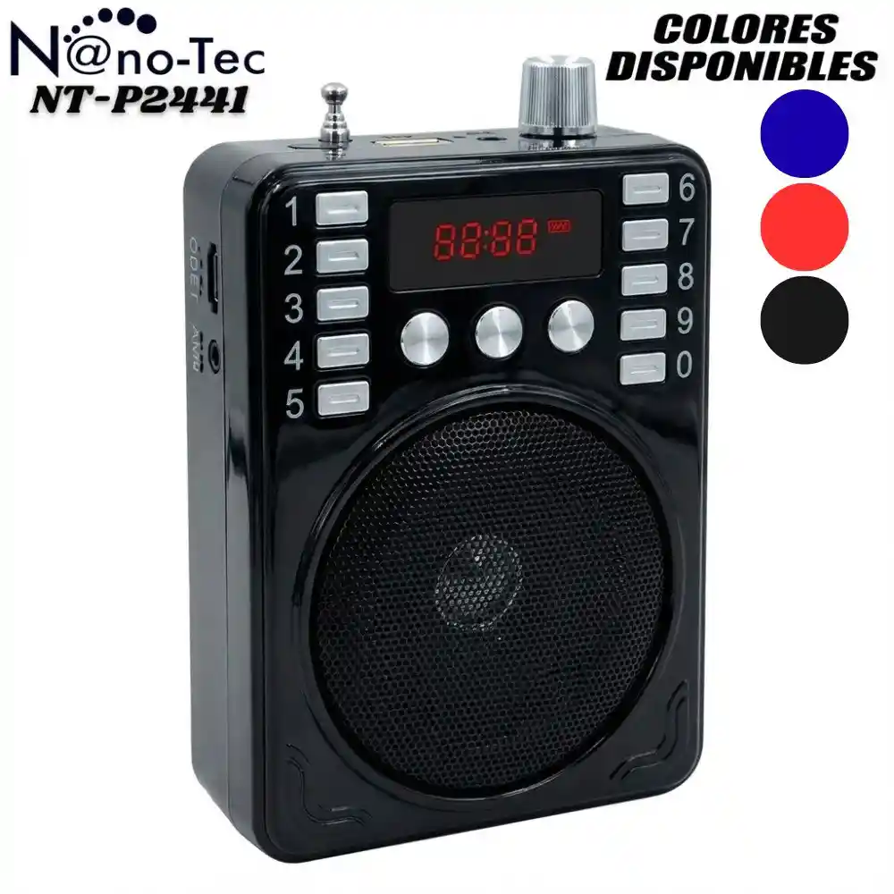 Radio Parlante Con Perifoneo Nano-tec NT-P2441 Podrás disfrutar de tu música favorita en cualquier momento, gracias a sus dimensiones y la función de recargable permite llevarlo a cualquier lugar. Cuenta con la opción de escuchar música tanto en USB y en dispositivos que tengan bluetooth, también tiene la opción de utilizar el micrófono al mismo tiempo que está reproduciendo la música y en caso de que tengas una grabación de alguna conferencia o algún mensaje puedes repetirla varias veces automáticamente sin ningún problema. DISPONIBLE EN COLOR: Negro, Rojo Y Azul NOTA: selecciona color de preferencia, en caso de no ser seleccionado, se enviará color sujeto a disponibilidad ESPECIFICACIONES TÉCNICAS: - Micrófono - Lector USB - Tarjeta TF - Radio FM - Pantalla digital LCD - Potencia de salida: 30 W - Frecuencia de respuesta: 87.5 Hz – 108 Hz - Batería: 3600 mAh Batería recargable de iones de litio - Tiempo de carga: Aproximadamente 8-10 horas - Tiempo de uso: Aproximadamente 20-25 horas (DEPENDIENDO DEL NIVEL DE VOLUMEN) Nota: Las imágenes publicadas son de referencia, el producto real puede presentar ligeras variaciones en su tonalidad de color.