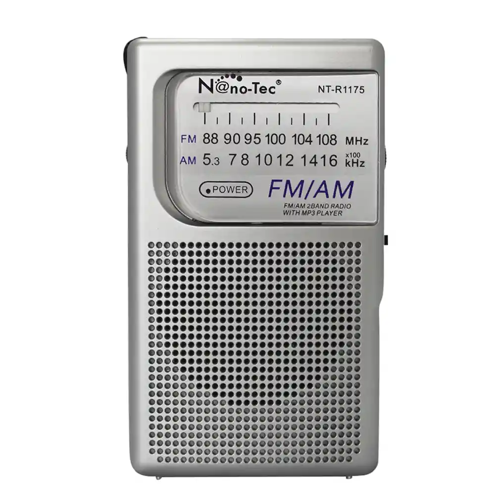 El Radio de Bolsillo Es ligero y funciona con opcion recargable o con pilas, por lo que puedes llevarlo a cualquier lugar contigo. También puedes escuchar con este radio tus emisoras preferidas de las bandas AM y FM, Tiene alta sensibilidad para la recepción de las emisoras gracias a su antena telescópica. Puedes conectarle audífonos lo cual hace que el radio sea más fácil de usar, Este radio es el compañero ideal para jornadas de deportes, trabajo, etc... Características destacadas Fácil de manejar y llevar. Radio AM/FM Es Recargable Portatil, liviano, ideal para llevarlo a todas partes. Con él podrás escuchar tus emisoras y programas favoritos Potencia 3 Watt Alta sensibilidad de Recepcion Altavoz Incorporado Antena Telescopica Entrada para Auriculares y Auxiliar Medidas: Alto 12 cm x Ancho 8 cm x Profundidad 3 cm Disponible en color gris