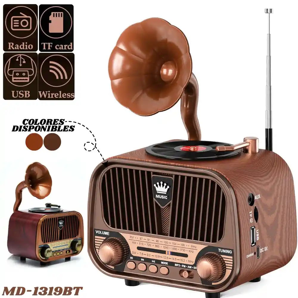 Radio Parlante Retro Vintage Recargable Am Fm Sw Mp3 Bluetooth MD-1319BT Dale un toque de elegancia y nostalgia a tu hogar con el Radio Parlante MD-1319BT. Su diseño inspirado en los clásicos fonógrafos de antaño. Este espectacular dispositivo combina una estética con acabados tipo madera y dial analógico, con la versatilidad moderna del Bluetooth y la reproducción multibandas. Es la pieza perfecta para tu sala, oficina o mesa de noche Características: - Diseño Exclusivo "Gramófono": Su principal atractivo es la bocina superior y el plato decorativo, que evocan la época dorada de la música. Es el regalo perfecto para los amantes de lo vintage. - Radio multibanda: Sintoniza tus emisoras favoritas con precisión gracias a su antena telescópica. Capta frecuencias en 3 bandas: FM: Para música y noticias locales. AM: Para programas de radio tradicionales. SW (Onda Corta): Para explorar señales internacionales. - Conectividad Bluetooth: Conecta tu celular, tablet o computadora de forma inalámbrica y usa el radio como un potente parlante para tus playlists de Spotify o YouTube. - Reproductor MP3 completo: Cuenta con puertos para memorias USB y ranura para tarjetas TF (MicroSD). - Batería Recargable: Llévalo a donde quieras sin depender de un enchufe constante. Su batería interna te da libertad de movimiento. Especificaciones: Modelo: MD-1319BT. Bandas: AM / FM / SW. Entradas: USB / TF Card / Bluetooth. Alimentación: Batería recargable Paquete incluye: 1x Radio Parlante Retro 1x Cable de carga USB Nota: Las imágenes publicadas son de referencia, el producto real puede presentar ligeras variaciones en su diseño y tonalidad de color