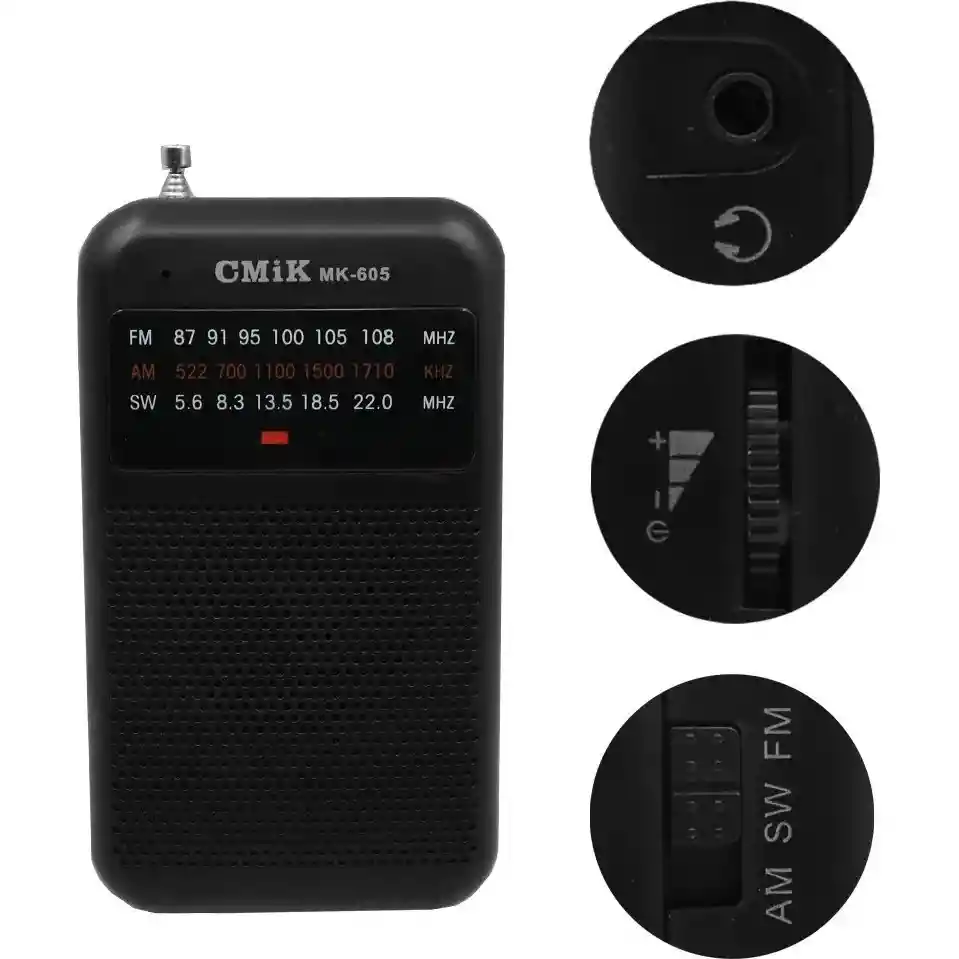 Radio Mini Cmik MK-605 Banda: FM / AM / SW Alimentación: Pilas AA (no incluidas) Antena incorporada El Radio Mini Cmik MK-605 es ideal para usar en la habitación, gracias a su sintonización de emisoras en bandas FM, AM y SW. Compacto, portátil y fácil de usar. Color disponible Negro Especificaciones técnicas Ancho: 7 cm Largo: 12 cm Alto: 3 cm Características Sintoniza bandas FM / AM / SW Funciona con pilas AA (no incluidas) Antena retráctil para mejor recepción Contenido del empaque 1 Radio Mini Cmik MK-605 1 Manual de instrucciones 1 Caja de empaque