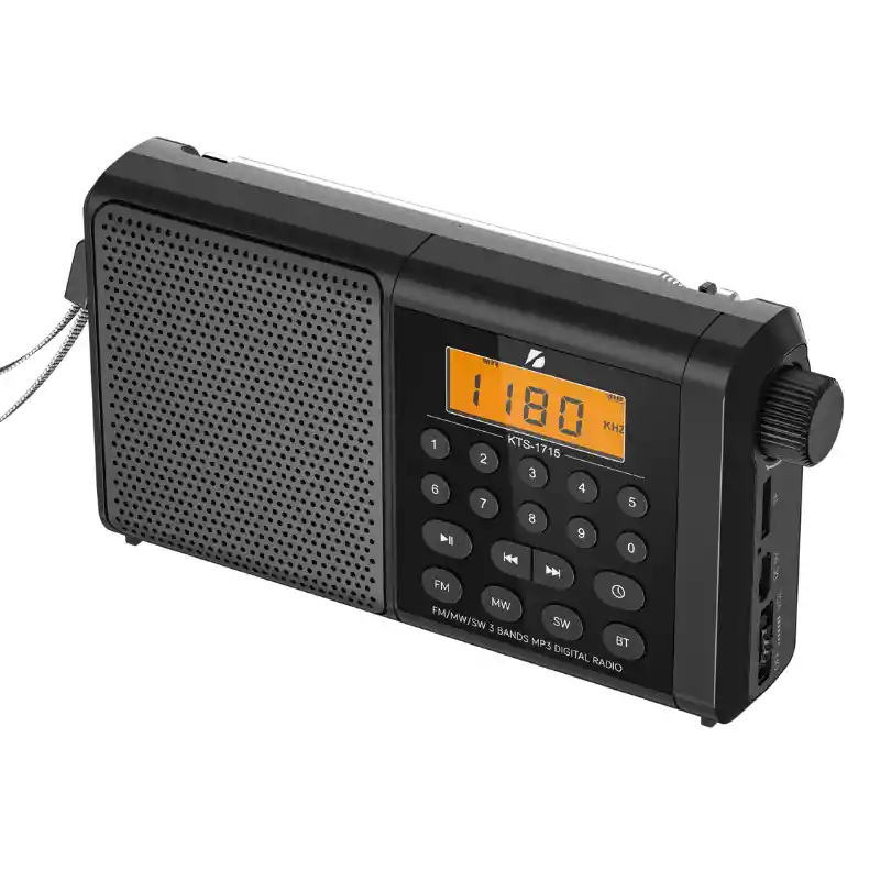 Radio Portátil KBroad KTS-1715 – 3 Bandas con Parlante Integrado La KBroad KTS-1715 es una radio portátil diseñada para ofrecer entretenimiento versátil tanto en casa como al aire libre. Su sistema de recepción multi-banda permite escuchar emisoras AM, FM y SW con excelente claridad, mientras que su parlante integrado reproduce música desde múltiples fuentes, convirtiéndola en un equipo funcional y práctico. Características principales Sintonizador de 3 bandas: AM, FM y SW para disfrutar de una amplia variedad de emisoras y señales de radio. Parlante integrado con potencia adecuada para escuchar música con buena calidad de sonido. Conectividad Bluetooth: permite reproducir música de forma inalámbrica desde celulares, tablets o cualquier dispositivo compatible. Reproducción desde USB y tarjeta microSD: reproduce directamente archivos MP3 sin necesidad de conexión Bluetooth. Diseño portátil: con asa o tamaño compacto, ideal para uso doméstico, exteriores o actividades recreativas. Antena extensible: mejora la recepción de señales en todas las bandas. Controles simples: volumen, selección de banda y sintonización intuitivos para uso fácil. Alimentación dual: funciona con batería recargable o a corriente Ventajas Permite escuchar radio tradicional y música digital desde múltiples fuentes. Conectividad Bluetooth para transmisión inalámbrica. Puertos USB y microSD para reproducción local de música. Portátil y fácil de transportar donde quieras. Buena recepción de señal gracias a la antena telescópica. Uso recomendado Esta radio portátil es ideal para quienes desean un equipo que combine lo mejor de la radio tradicional con funciones modernas de audio. Perfecta para el hogar, la cocina, talleres, viajes, camping o reuniones familiares, donde puedes escuchar tus emisoras favoritas o reproducir música desde tu dispositivo móvil. Contenido típico de la caja Radio portátil KBroad KTS-1715 Cable de alimentación Manual de usuario