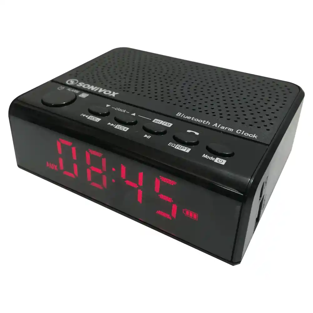 PARLANTE RADIO RELOJ INALÁMBRICO BLUETOOTH SONIVOX VS-RC1533BTFunciones: Con radio FM, reproductor de MP3 (tarjeta USB y TF)Hora de visualización / Despertador, conexión bluetooth, manos libresEl radio reloj con el tamaño adecuado para su mesa de noche. Este reloj FM es fácil de usar, tiene todo lo básico: una pantalla lcd retroiluminada para ver claramente la hora, alarma, una batería de respaldo y dos opciones para despertar ( Radio FM o la alarma).Si eres de los que todavía gustan de escuchar radio en las mañana al momento de despertar, este es el producto para ti. Un Radio Reloj sencillo, que te ayudará a despertarte en las mañanas. Con su display LED de color Rojo, y sus opciones de alarma te despertarás sin problema al sonido de tu emisora favorita.Radio FMDespertadorBotón Alarm grandeDisplay LED color rojoEntrada de linea (Aux)TF lector de tarjetas para reproducción de mp3 usbImpedancia: 4pPotencia de salida: 3WBatería incorporada: 1800mAHAlimentación 5V 500mA-2000mADimensiones: Alto: 9 Cm Largo: 11 Cm Ancho: 4 CmEl paquete incluye:1 x Radio LED1 x Cable 2 a 1 de Carga USB y Auxiliar1 x Manual de usuario