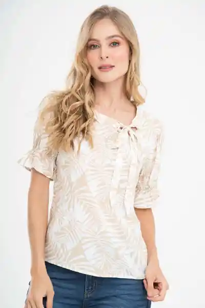 Blusa en Chalis Estampado Manga Corta Con Elástico en Puño y Bolero en Ruedo Silueta Semi Ajustada.