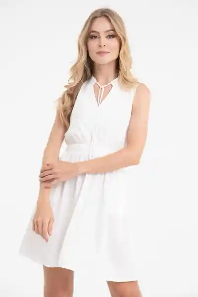 Vestido Corto en Chalís Fondo Entero Cuello Nerú Escote en V Sisa Sesgada Pretina Resortada Con Elástico Bolsillos Laterales Silueta Semi Ajustada.