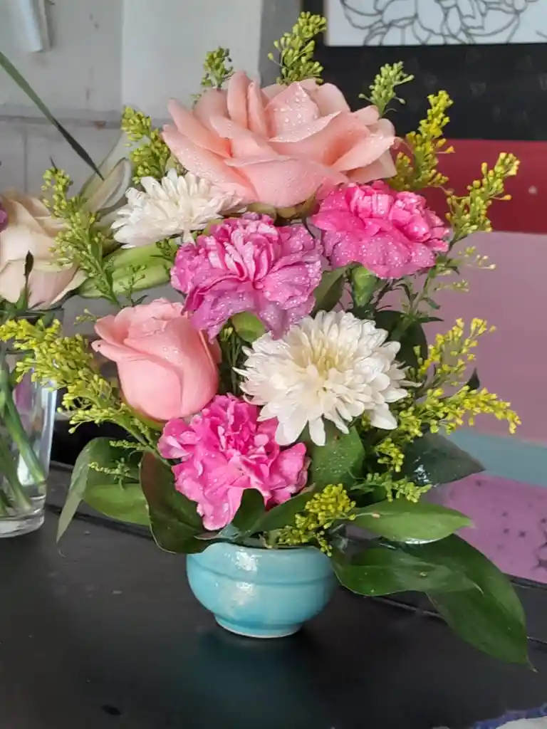 Un ramo en base de porcelana con rosas y flores sería una pieza elegante y delicada. La base de porcelana añade un toque de sofisticación y durabilidad al arreglo floral. Las rosas, con su belleza clásica y su variedad de colores, podrían ser el centro del arreglo, aportando romance y elegancia.