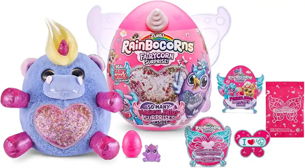 Rainbocorns Fairycorn Surprise: Todos los nuevos Rainbocorns mágicos y adorables para coleccionar. Existen 7 personajes para descubrir: Toof el conejito, Vacay el perrito, DJ el unicornio, Styla el gatito, Abra el búho y Honey el excepcional hipopótamo dorado, todos con capas de sorpresas mágicas para revelar. Con alas de hada que puedes usar: Cada juguete Fairycorn viene con alas mágicas de hada que puedes usar. Incluyen lazos ajustables que garantizan que las alas se adapten cómodamente. Capas de sorpresas mágicas: Hay muchas sorpresas para coleccionar, como el corazón de hada con brillantina, la popó de hada que cambia de color y los nuevos y adorables Boo-Boocorns de hada. Contenido del paquete: 1 huevo Rainbocorns, 1 peluche Rainbocorns Fairycorn, 1 accesorio de corazón de hada con brillantina, 1 par de alas de hada con lazos, 1 huevo de hada Boo-Boocorn, 1 popó Rainbocorn, mezcla de colores de algodón de azúcar, 1 pista para sacar el cascarón, 1 guía para coleccionistas. Los Rainbocorns son el mejor huevo sorpresa. Con una combinación de un desempaque misterioso, sorpresas extravagantes y peluches cariñosos, los Rainbocorns seguramente será tu nuevo mejor amigo.