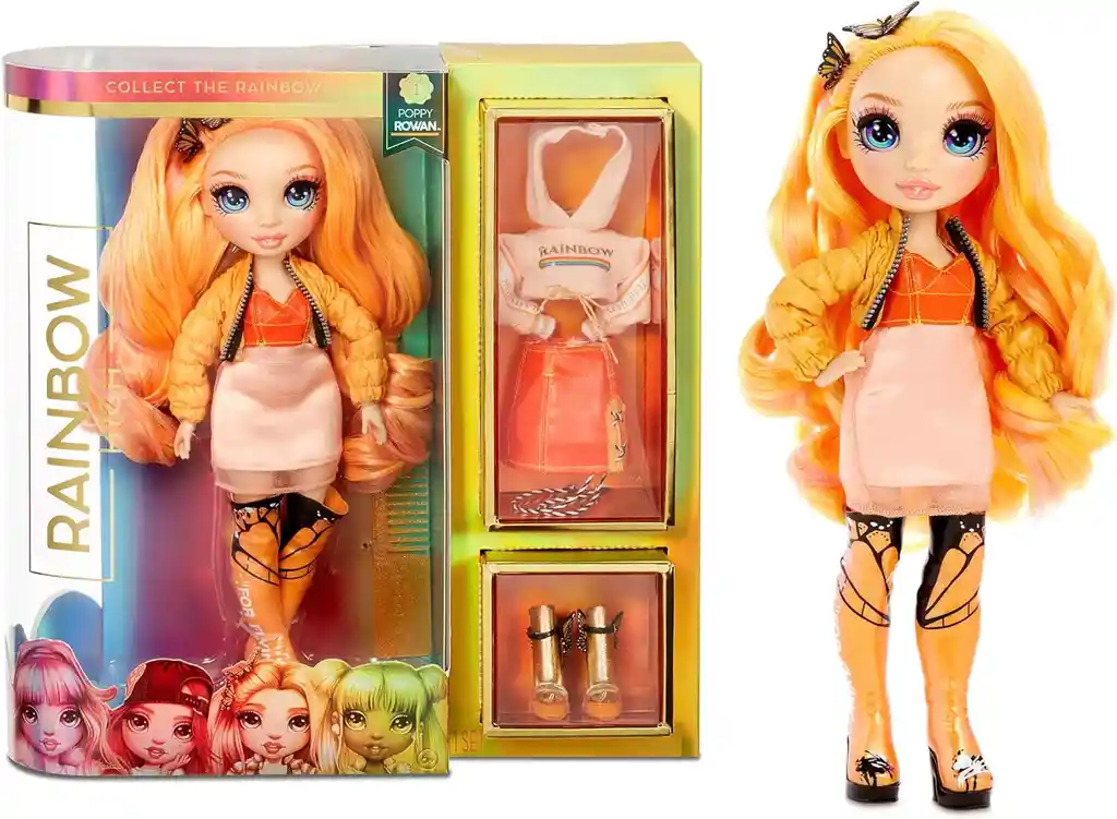 ¡Colecciona el arco iris de muñecas de moda con Rainbow High! 🌈 Poppy Rowan está vestida de naranja de la cabeza a los pies 🍊 y tiene un cabello hermoso 💁♀️. Viene con 2 atuendos completos, perfectos para mezclar y combinar 👗👚, incluyendo una blusa corta, sudadera, falda, abrigo hinchado y tacones 👠. ¡Sus botas de mariposa son súper geniales! 🦋✨