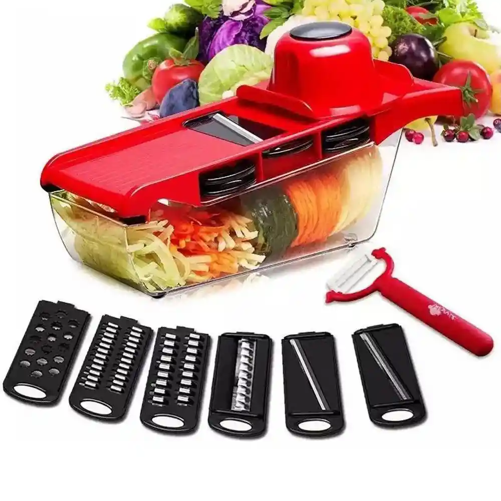 Cortador de verduras multifunción 6 en 1, las cuchillas de la cortadora de verduras son fáciles de configurar y restaurar, corta muy rápidamente en diferentes espesores y una variedad de estilos, papa, cebolla, queso, zanahoria, tomate, pepino, ajo, jengibre y frutas, en juliana o rebanada, ondulada o recta. Todo en tamaño perfectos, ahorre tiempo. Con este kit de cocina para cortar, puede ahorrar un 70% de tiempo, diga adiós a los ojos llorosos al cortar cebollas; Y te ayuda a preparar la comida de forma más elegante Cortadora de mandolina desmontable- ¡Base de contenedor de comida para atrapar todos tus cortes!- Cuenta con 6 cuchillas de acero inoxidable intercambiables- Rebanador recto: ¡perfecto para rebanar pepino fresco o papas fritas finamente cortadas!- Rallador - para tus quesos o zanahorias- Rallador fino - ¡Ideal para rallar ajo,
