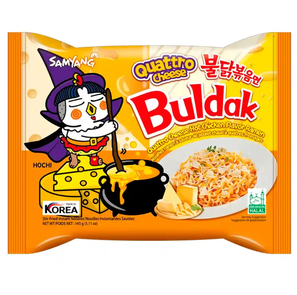 Ramen instantaneo 145g .Coreano BULDAK. El sabor de 4 Quesos: Mozzarella, Cheddar, Camembert, Queso Gouda. ¡Menos picante, más cremoso! (Tu regulas el picante decidiendo cuanto contenido del sobre pones en la preparación)