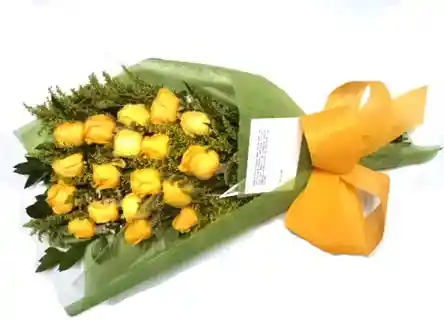 Ramillete. Contiene: 18 rosas, Papel celofan, tarjeta. Follaje: aster y rusco, tela micro fibra Moño