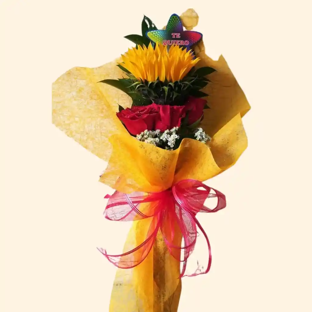 Incluye: Girasol, rosas, Ruscus, Gipsofilia, pin, papel decorativo, moño de color Multicolor ideal para el Felicitaciones