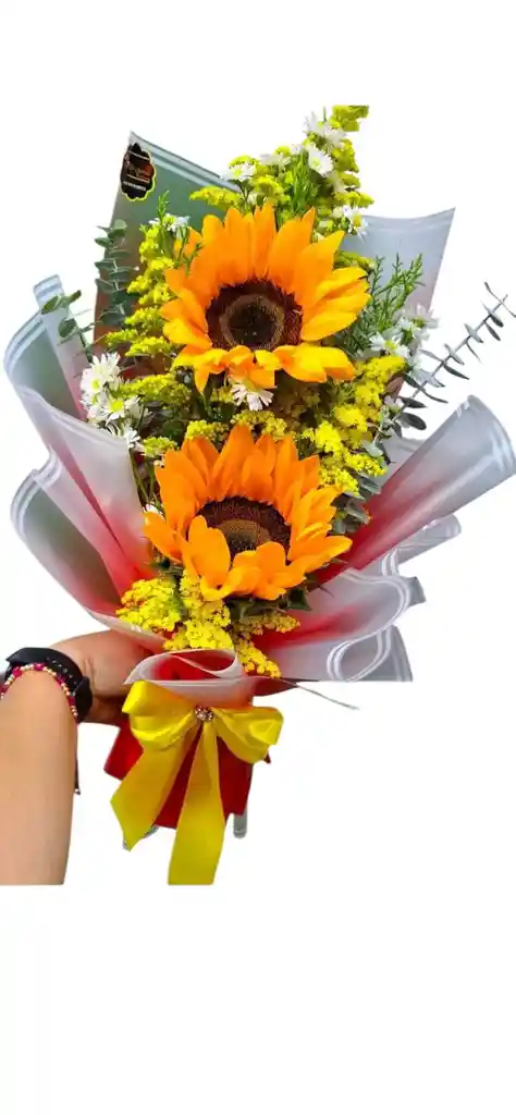 Ramillete de dos girasoles con relleno de follaje envuelto en papel coreano más un lazo