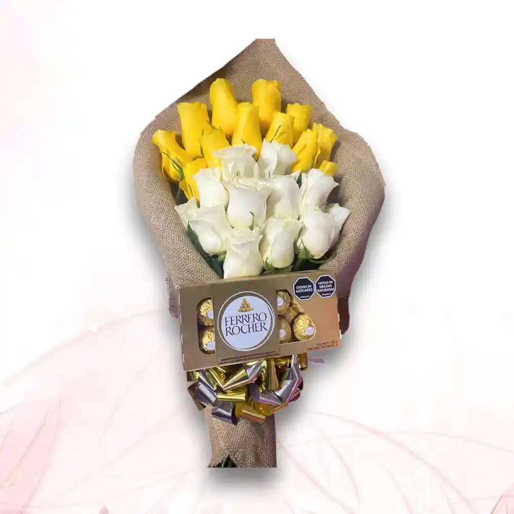 Elegante ramillete dispuestas en escala, acompañado de 8 chocolates Ferrero Rocher, presentado con un diseño sofisticado y romántico. Ideal para aniversarios, cumpleaños y ocasiones especiales.
