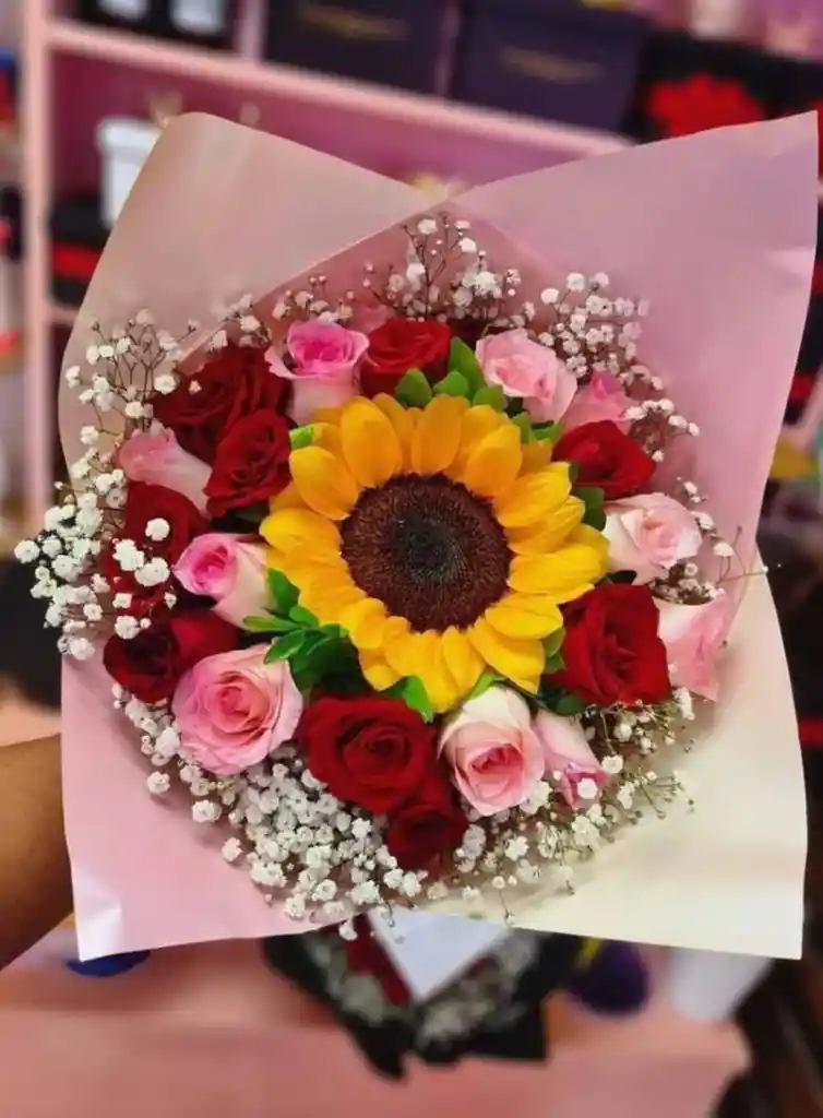 hermoso ramillete de rosas y girasol