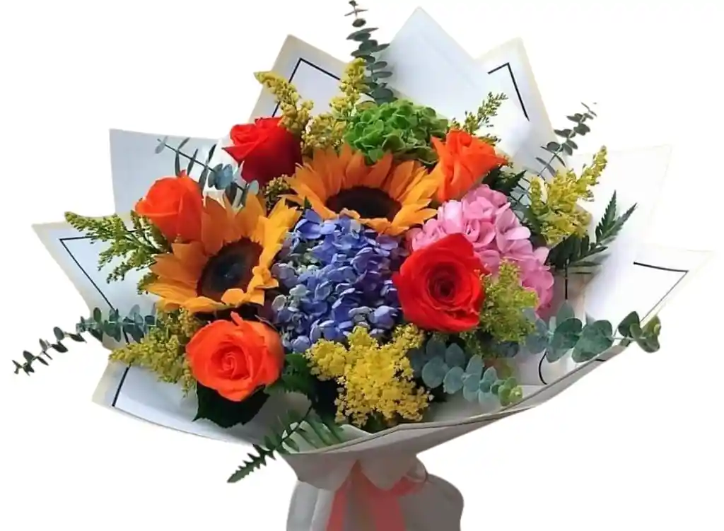 Hermoso ramillete en flores surtidas, Girasoles, rosas, hortensias, soliaster y follaje verde. Envoltura en papel coreano lazo cinta