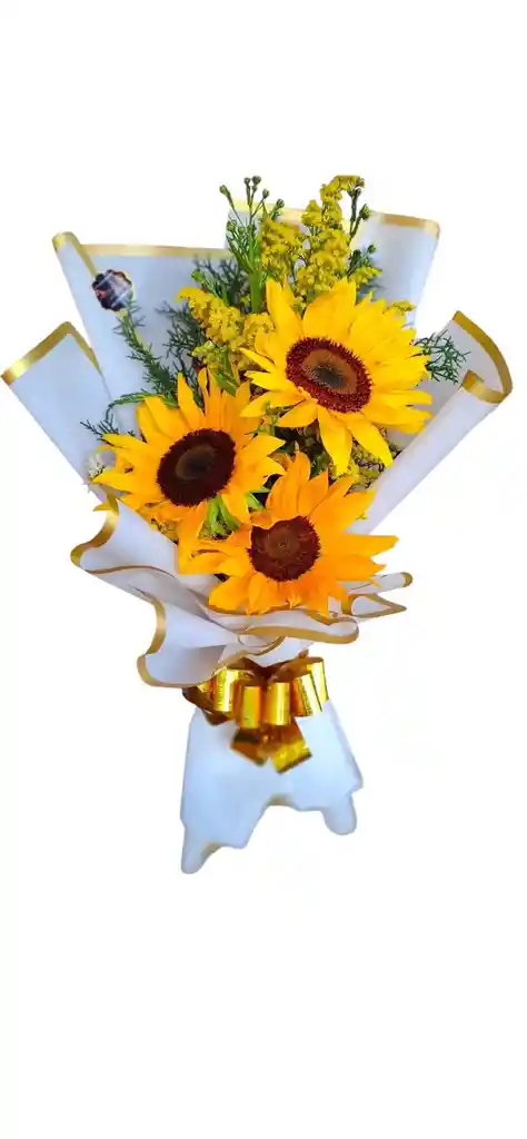 Ramillete de 3 girasoles acompañado de follaje envuelto en papel coreano y un lazo.