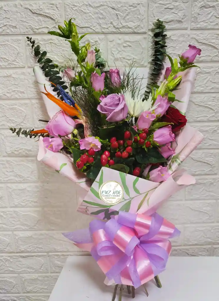 Ramo vibrante y elegante que combina rosas púrpuras y rojas, la exótica flor Ave del Paraíso, campanilla y follaje variado, envuelto en papel floral rosa y un hermoso lazo doble. Toda ocasion