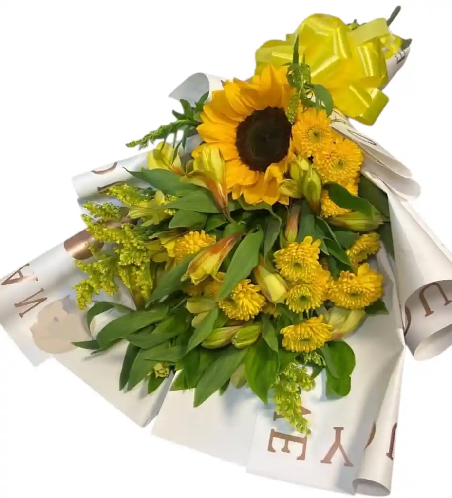 Ramillete de girasol, astromelias, tinopio y soliaster, envuelto en papel coreano.