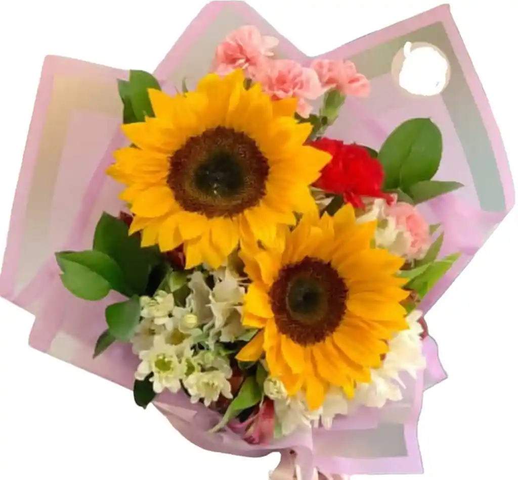 Hermoso ramillete de dos girasoles acompañado de clavellinas margaritas y follaje verde envoltura en papel coreano lazo cinta