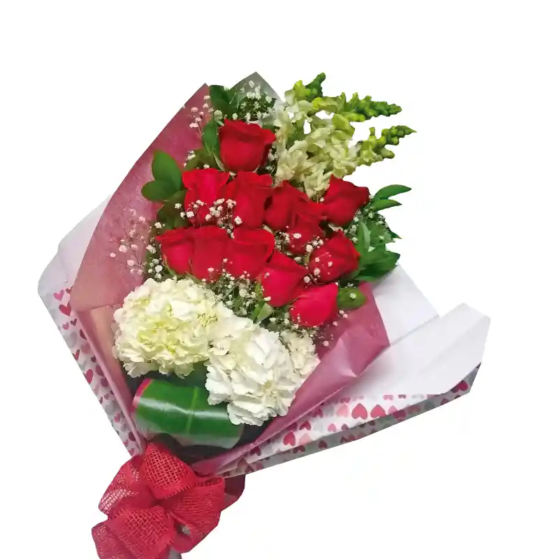 Rosas, ortensias, gipsophilia, boca dragon, hoja de carey, rusgo