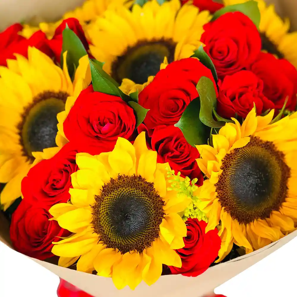 Ramillete redondo de 24 Rosas rojas y 6 Girasoles 30cm de diámetro por 50cm de altura Follaje Ruscus Verdes y Solidago Amarillo Empaque papel Kraf Mono satinado rojo