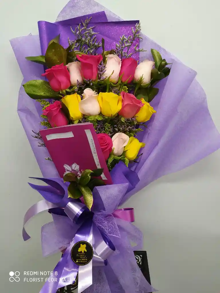 Elaborado en papeles decorativos, follaje, complemento, moño y tarjeta