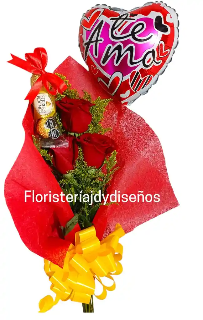Ramillete de 3 rosas rojas, globo metalizado R-10 y Chocolate Ferrero Rocher por 3 unds.