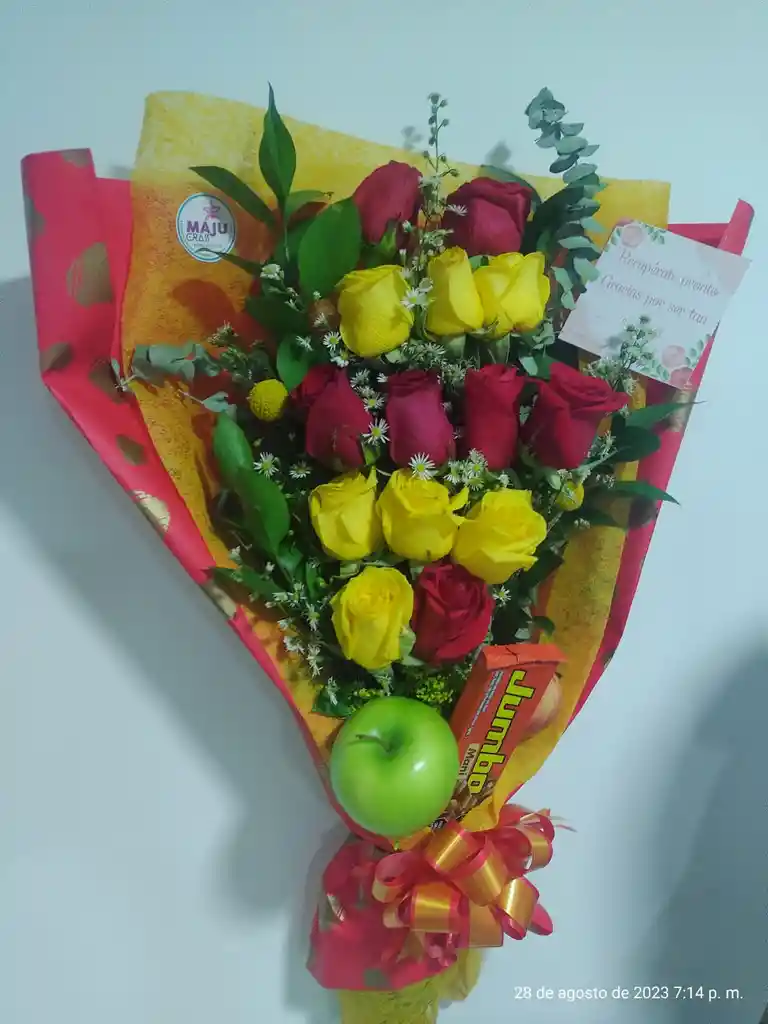 Arreglo floral en ramillete con chocolatina y dos deliciosas manzanas.
