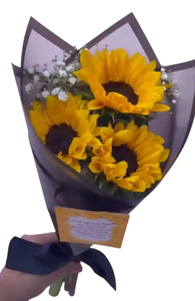 Ramillete de girasol, gisofilia y aster, envuelto en papel coreano, lazo cinta.
