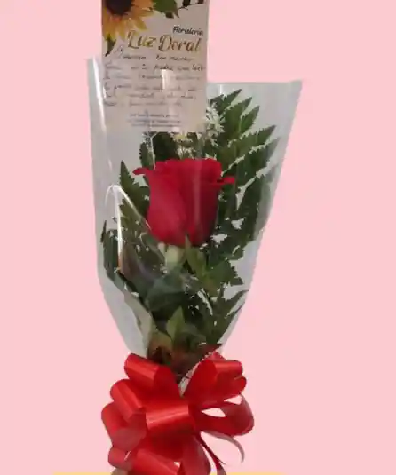 RAMILLETE DE 1 (UNA) ROSA ROJA DECORADO CON FOLLAJE VERDE Y BLANCO, CON PAPEL , MOÑO DECORATIVO Y TARJETA.