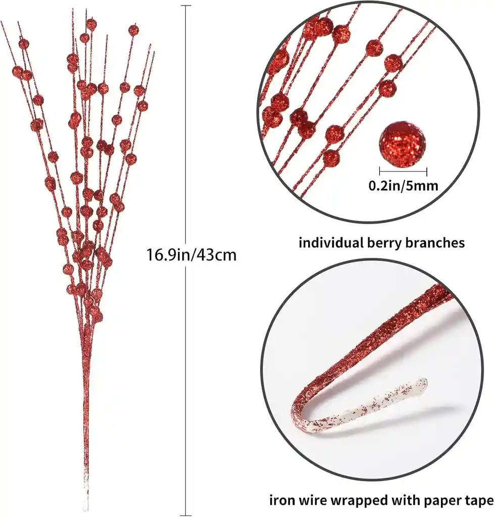 Decoración de tallos de bayas artificiales con purpurina para Navidad, palitos decorativos de cuentas, ramas brillantes para árbol de Navidad