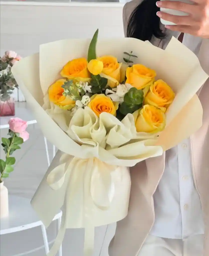 tiene 7 tallos amarillos, papel coreano blanco y su moño del color que desees
