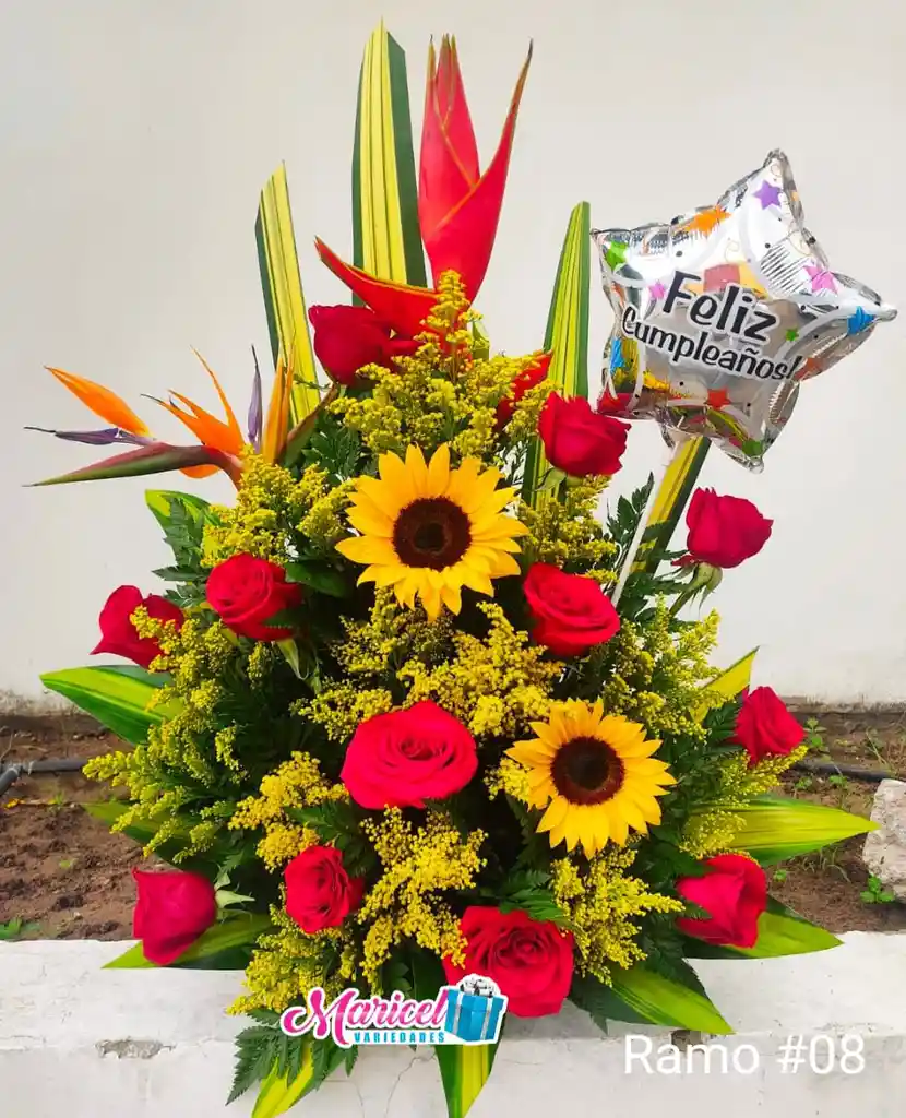 elaborado en base de vidrio con 12 rosas, helecho, ruscus, hojas de dracena, sólidaster, heliconia, 2 girasoles grandes, ave de paraíso, globo mediano metalizado y tarjeta personalizada de color Multicolor ideal para el Felicitaciones
