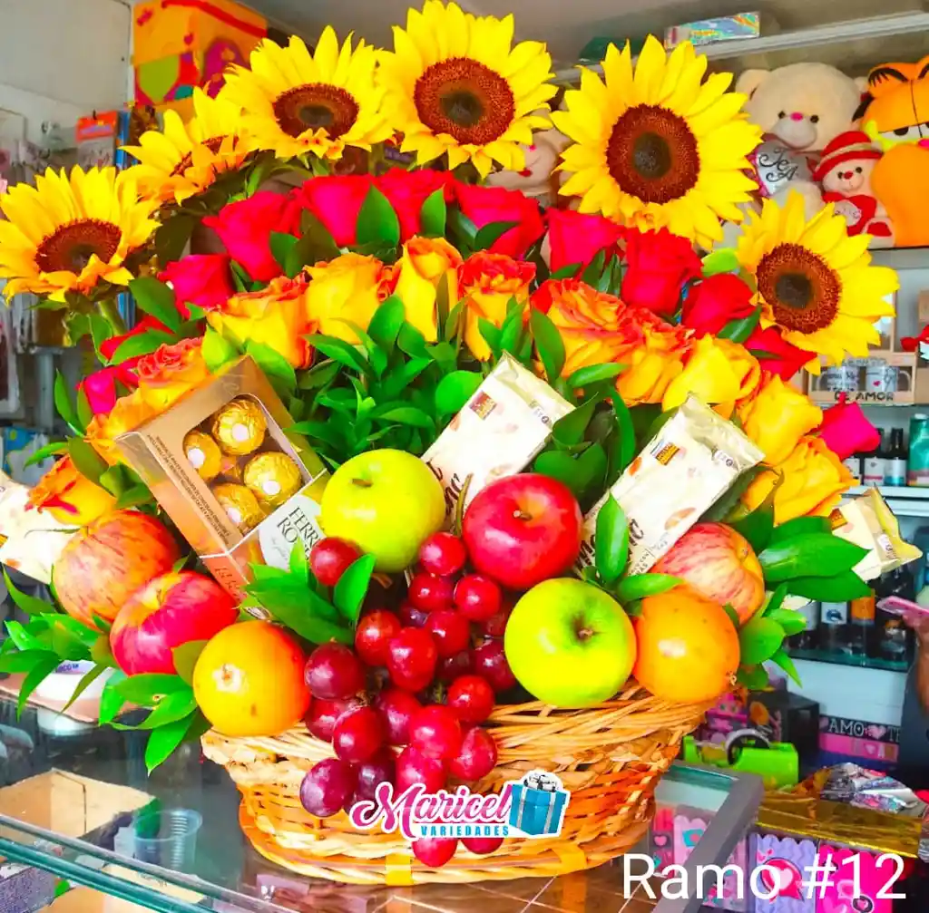 elaborado En canasta grande artesanal, 6 girasoles grandes, 24 rosas, follaje, ruscus, chocolates Ferrero Rocher x8und, chocolate nscionales surtidos, frutas surtidas, cintas decorativas, tarjeta personalizada de color Multicolor ideal para el Felicitaciones
