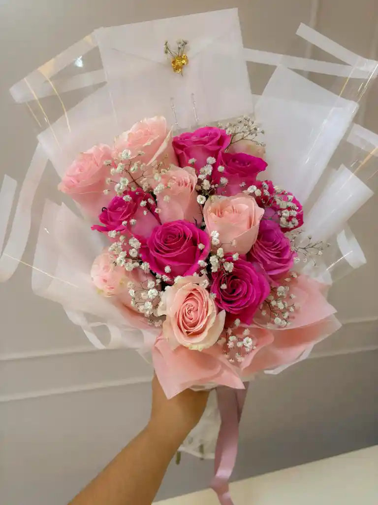 El regalo que enamora. Incluye: Bouquet de 12 rosas (6 rosas rosadas y 6 fucsias) Decoradas con follaje (Gypsophilia y Eucalipto) Envueltas en fino papel estilo coreano. Lazo, Mariposa tarjeta personalizada con tu mensaje (escríbelo en notas).