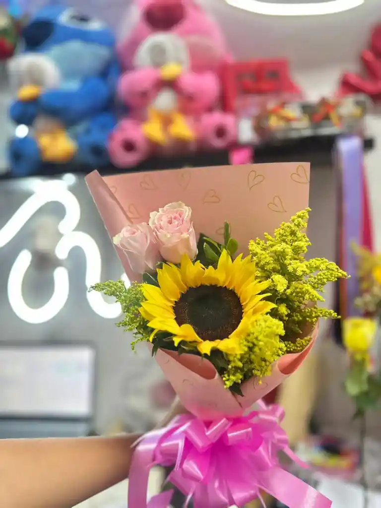 1 GIRASOL CON 2 ROSAS ROSADAS DECORADAS EN PAPEL COREANO