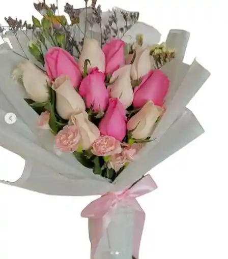 Bouquet alargado de 18 rosas rosadas y blancas acompañadas de follaje, decoradas con papel y moño