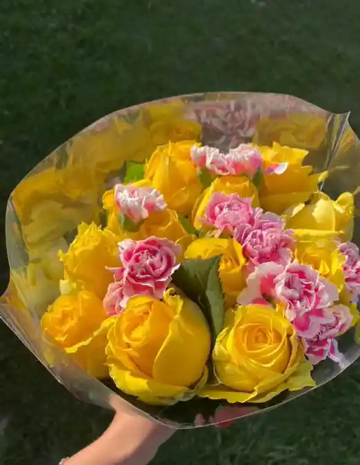 "Alegría vibrante" este ramo de flores combina la elegancia de las rosas amarillas con la delicadeza de los claveles rosados. Las rosas amarillas, símbolo de amistad y alegría, se entrelazan con los claveles rosados, que representan gratitud y admiración. El contraste de colores crea una armonía visual que capta la atención y evoca sentimientos de felicidad y aprecio. La imagen muestra el ramo sostenido por una mano, con un fondo de césped verde que resalta aún más la belleza de las flores. Este ramillete es perfecto para alegrar el día de alguien especial o para decorar cualquier espacio con un toque de naturaleza y color.