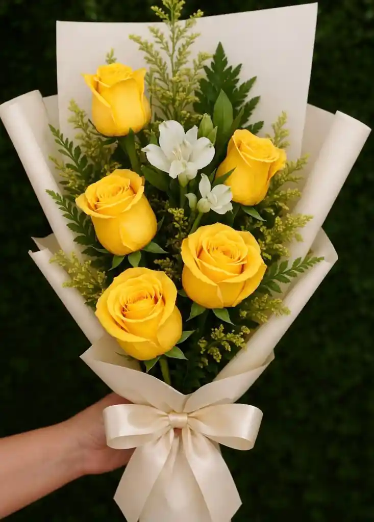 Ramo de 5 rosas amarillas mas follaje en papel coreano
