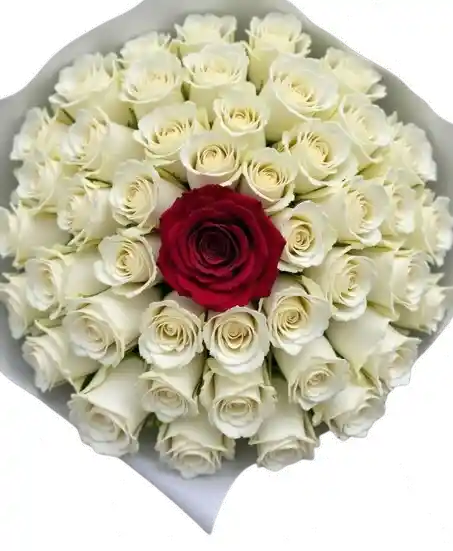 Un elegante ramo compuesto por delicadas rosas blancas que envuelven una única rosa roja central, creando un contraste visual impactante y lleno de significado. Su diseño circular y armonioso transmite pureza, amor profundo y exclusividad en cada detalle 💐🌸 Elaborado con flores frescas de calidad premium, este arreglo destaca por su diseño refinado y su simbolismo único. Es ideal para declaraciones de amor, aniversarios o momentos en los que deseas expresar sentimientos verdaderamente especiales 🌷 Algunas flores o tonalidades pueden variar ligeramente según disponibilidad de temporada, asegurando siempre la frescura y belleza del arreglo. Incluye una tarjeta personalizada gratis para que acompañes tu regalo con un mensaje significativo.