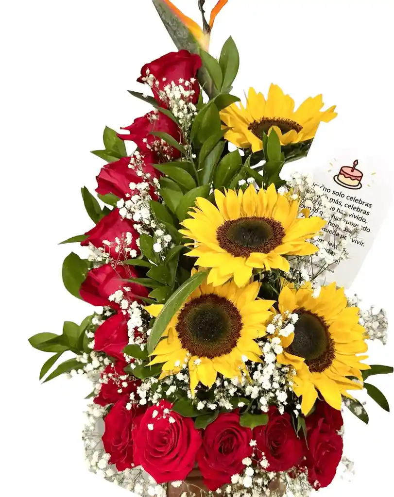 contiene 14 rosas rojas 4 girasoles ave del paraíso follaje follaje blanco decoración tarjeta personalizada