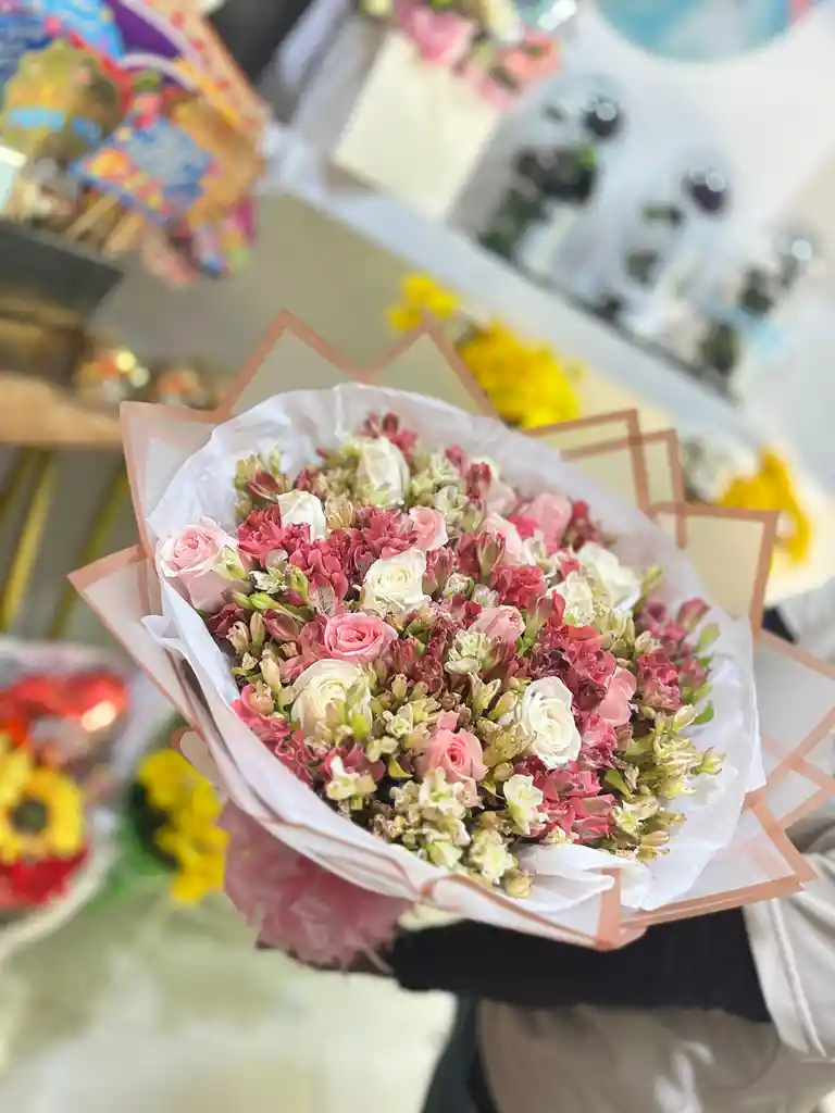 RAMO astromelias rosadas y fucsias rosas blancas y rosadas decoracion en papel coreano moño y tarjeta