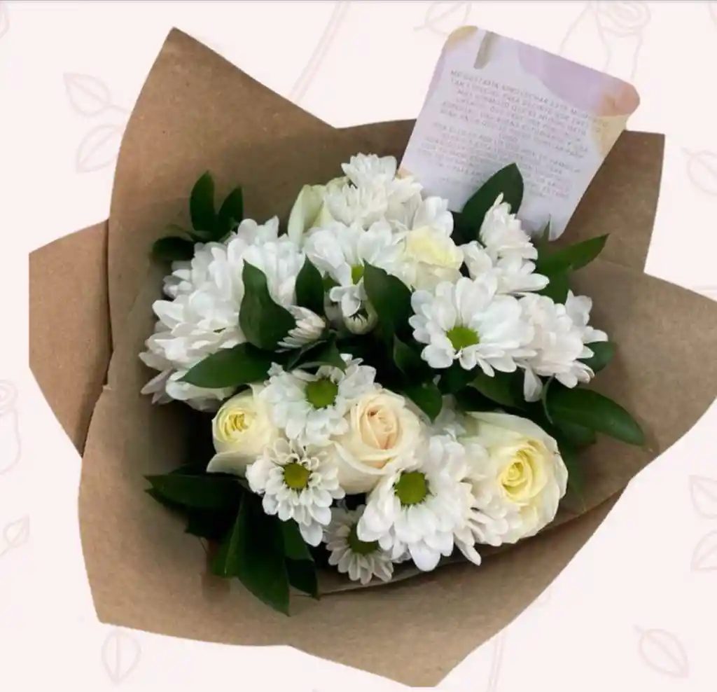 RAMO DE ROSAS BLANCAS Y MARGARITAS O POMPONES BLANCOS DECORADA CON RELLENO FLORAL, PAPEL COREANO Y MOÑO DECORATIVO. INCLUYE TARJETA PERSONALIZADA.