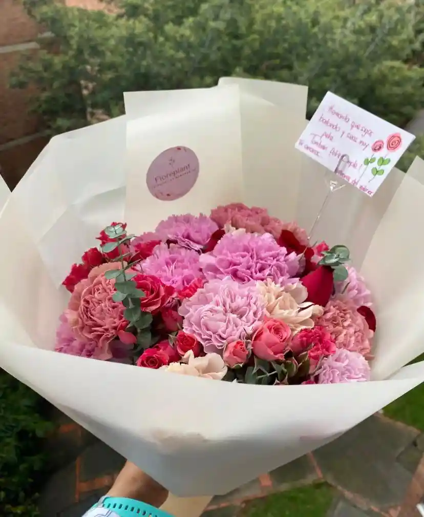 El Ramo Rosado Encanto es una combinación perfecta de ternura y elegancia. Elaborado con aproximadamente 12 claveles en tonos rosados, rosas baby y un toque de eucalipto fresco, este ramo transmite amor, gratitud y dulzura en cada pétalo. Envuelto en papel perlado color marfil y terminado con moño satinado, es un detalle ideal para cumpleaños, aniversarios, amor y amistad o simplemente para alegrar el día de alguien especial. ✨ Incluye: • Claveles frescos en diferentes tonos rosados • Rosas baby o minirosas • Toque de eucalipto o follaje fino • Envoltura premium y moño satinado 🚚 Entrega el mismo día en Bogotá 💖 Hecho con amor por Fioreplant, especialistas en flores que enamoran.