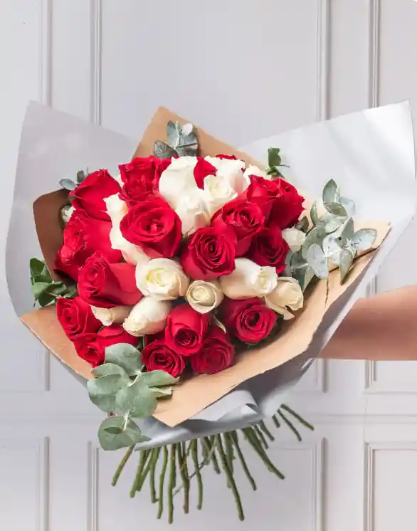 Este precioso ramo buchón contiene 50 hermosas rosas, con una combinación de rojas y blancas perfecta para cualquier ocasión. Un bonito regalo para expresar tu amor o alegrar el día de alguien especial.