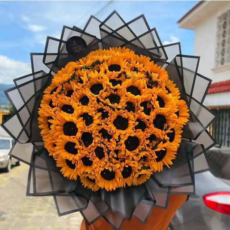 Ramo buchón de 40 girasoles Nota: La flor puede ser sustituida dependiendo la disponibilidad de color y del producto “Mensaje Personalizado” máximo de 30 caracteres (Dejar el mensaje en el chat, los comentarios no se previsualizan para la tienda por lo que si se dejan allí no podrá ser incluido).