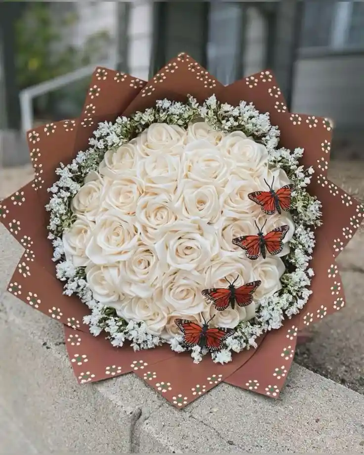 Ramo buchón de rosas blancas Un elegante y refinado ramo con 24 rosas blancas que representan pureza y tranquilidad, perfecto para momentos especiales y significativos. Nota: La flor puede ser sustituida dependiendo de la disponibilidad de color y del producto. "Mensaje Personalizado" máximo de 30 caracteres (Dejar el mensaje en el chat, los comentarios no se previsualizan para la tienda, por lo que si se dejan allí no podrá ser incluido).