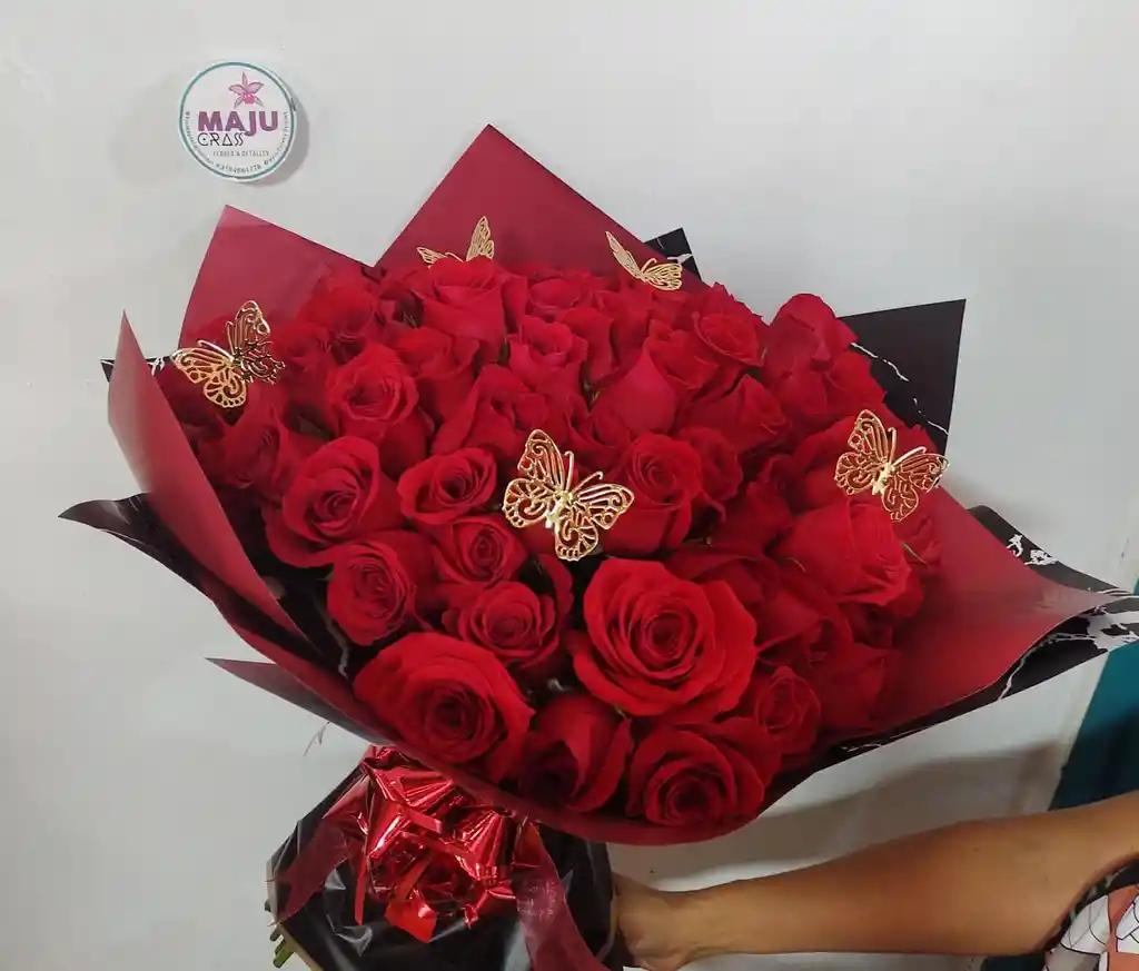 Impresionante ramo de 50 rosas rojas frescas, adornado con delicadas mariposas doradas, ideal para expresar amor y pasión en cualquier ocasión especial con un toque de lujo y romanticismo.